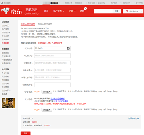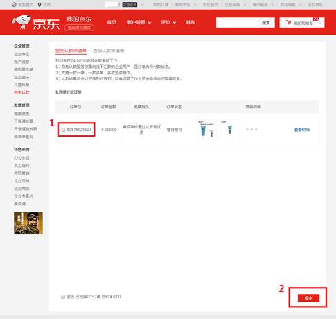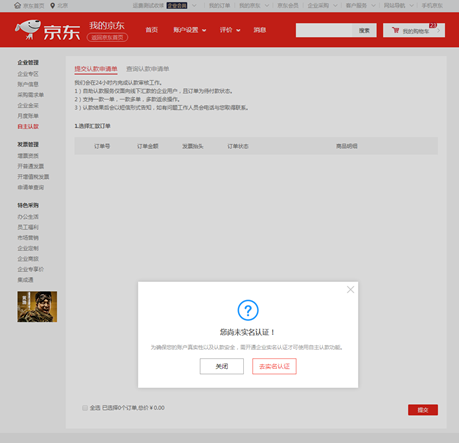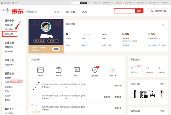 1、 自主认款入口:主站企业用户登录账号后,我的京东(https://home.jd.com/ )首页左侧导航点击“自主认款”即可进入;