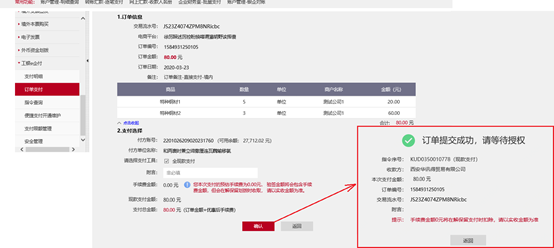 ①登录企业网银,选择“付款业务->工银e企付->订单支付”菜单,选择对应的付款记录,点击“确认”按钮。