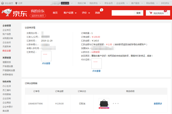 申请单详情中可查看各项提交的认款申请信息,包括认款状态及驳回原因;