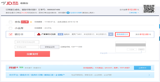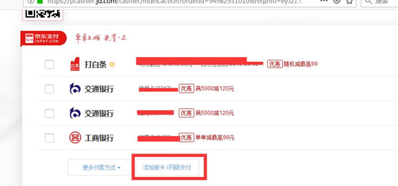 进入订单的付款页面,选择“添加新卡/网银支付”