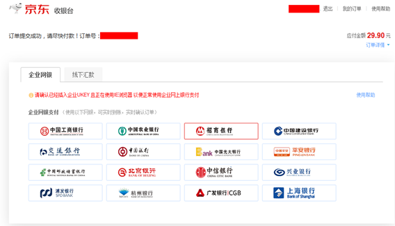 目前支持六家银行付款(招商银行、工商银行、光大银行、交通银行,浦发银行,平安银行)