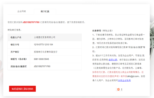 (一)功能介绍:用户线下汇款支付后,如未填写汇款识别码,可以通过将相关打款信息与汇款用途关系备注,进行全线上、自助化的认款服务;页面链接:https://corp.jd.com/self/preRemittanceOrderList