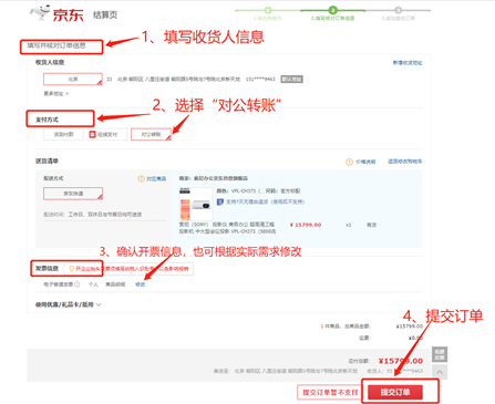 2、在结算页面,填写好收货人信息后,支付方式选择“对公转账”,确认所需要开票的主体信息后,点击“提交订单”。