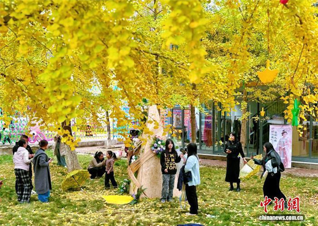 10月18日,游客在银杏树下拍照打卡。高展 摄