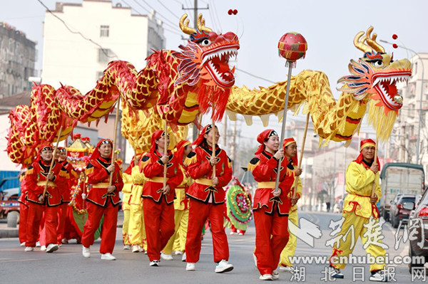 荆楚网(湖北日报网)讯(通讯员 左杨)锣鼓喧天、双龙飞舞、河蚌吐珠......2月18日上午,由牌楼镇本土民间艺人、文艺骨干组成的舞龙、采莲船、十班家什、蚌壳精、大头娃娃、唐僧师徒、歌舞、曲艺8支传统民俗表演队,身着各色服饰,手持特色表演道具,从镇新时代文明实践所出发,沿着集镇大道,一路踩街一路送祝福。沿街观看的人群不断欢呼鼓掌,洋溢着幸福的笑脸,居民们纷纷用镜头记录下精彩瞬间,留下美好的回忆。