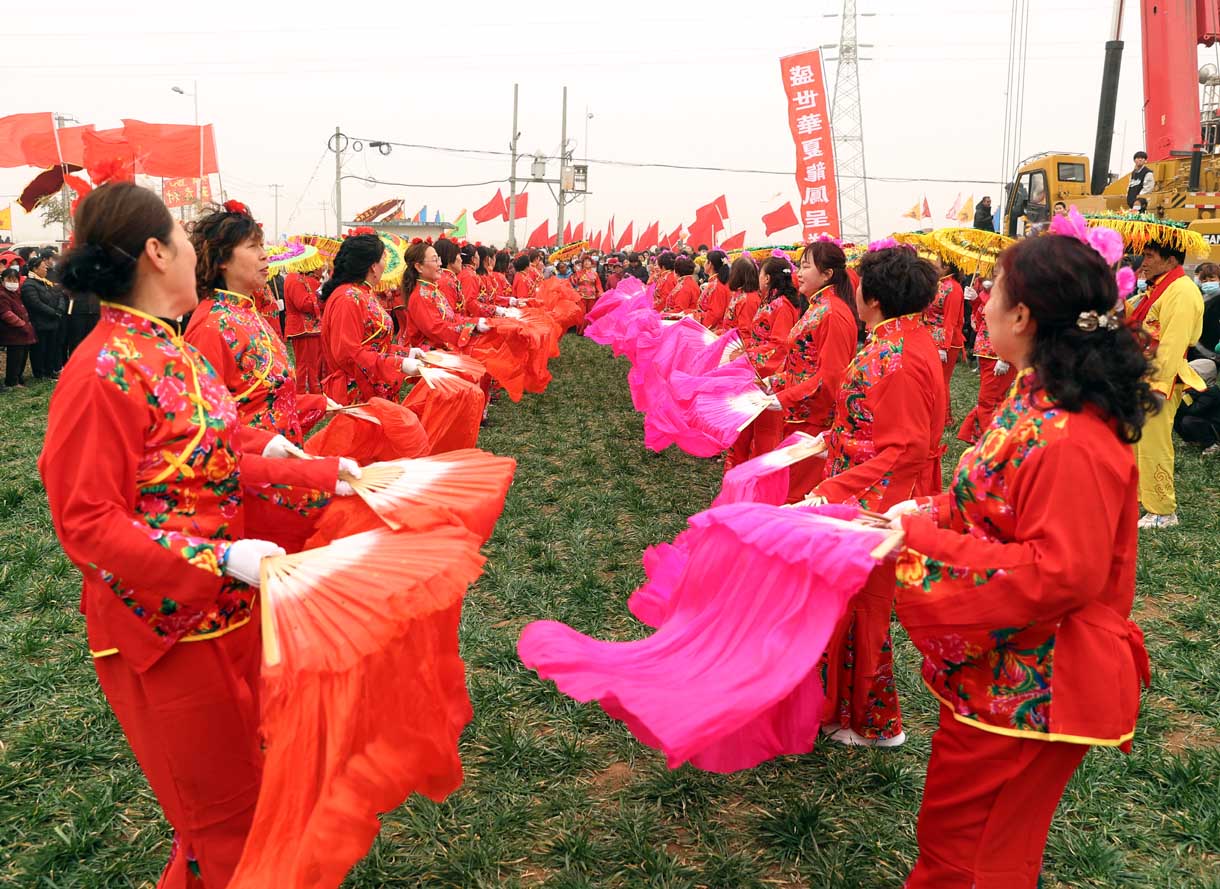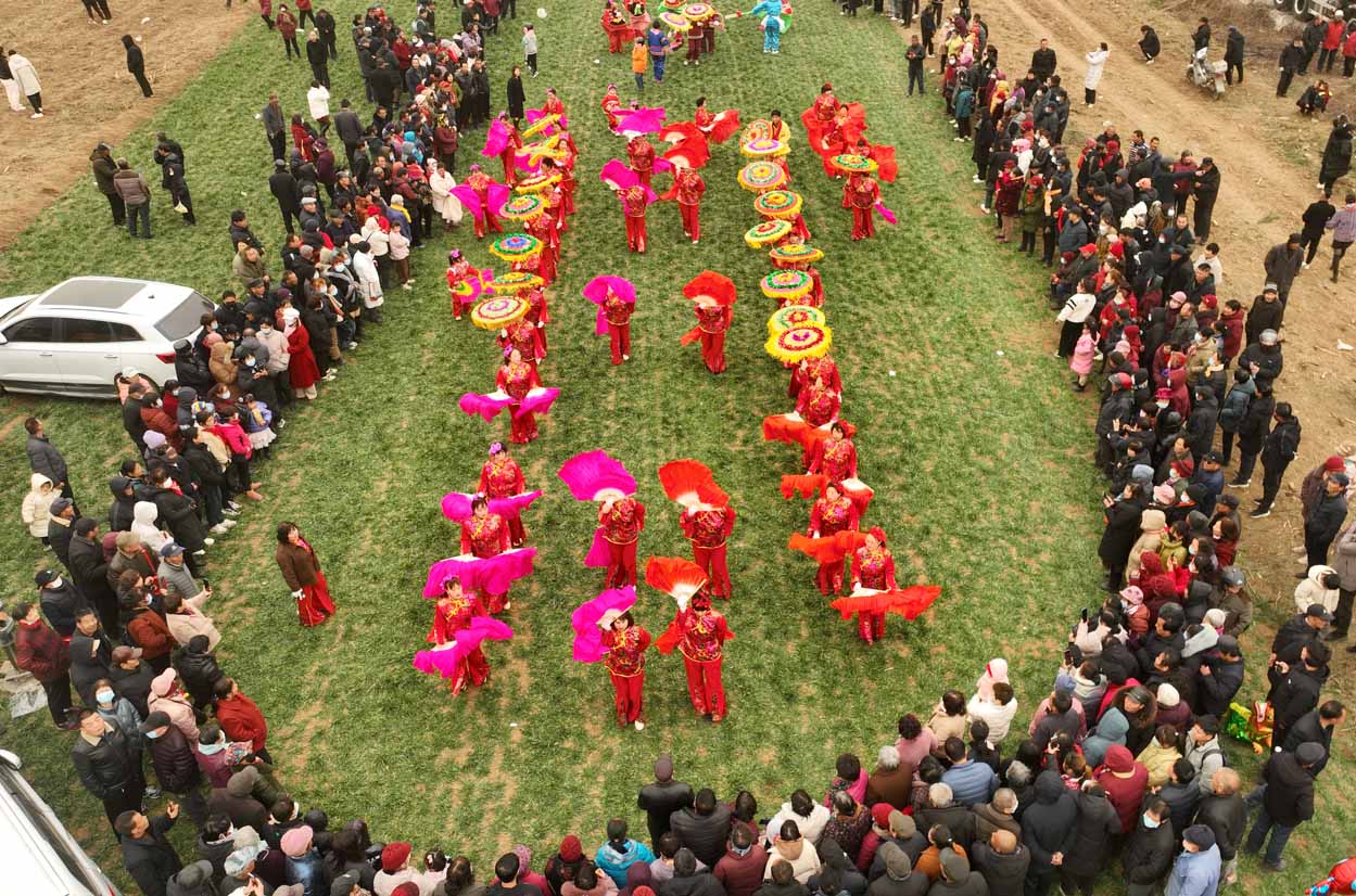 “快跑,南边开始扭秧歌了。”一名女孩朝着另一名正在举着手机拍人群的女孩喊了一声,两人随即转身朝东边一块麦地跑去。挤进人群,只见数十名穿着红颜色表演服装的女子举着花伞,正在绿油油的麦地里踏着鼓点扭着秧歌,队伍的后边跟着旱船和“毛驴”,他们夸张的表演动作逗得围观的人们哈哈大笑。