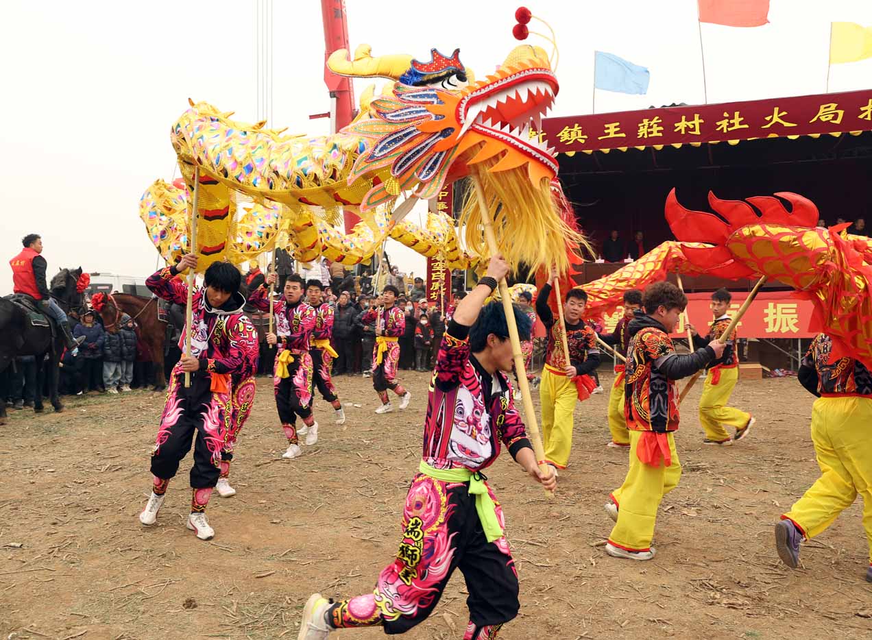 这时,两条各长20米,均由8名小伙子用长杆举着的“龙”从远处跑了过来。“大家都往后退,给把地方腾开,场子小了耍不开。”一名嘴里叼着大约半米长烟杆的老人向大伙喊道,就在人群后退的过程中,两条长“龙”便冲到人群中央,时而绕场游走,时而昂头冲向空中,时而在地上翻滚。振聋发聩的锣鼓声、叫好声、喊声、笑声顿时将现场变成欢乐的“海洋”。