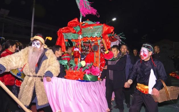 真正让这场“黑社火”表演气氛达到高潮的,是震撼人心的跑旱船表演,船姑娘“坐”在华丽美观的船舱内,老翁和肥婆娘在船的左右和船姑娘对舞,表演者唱着《敬状元》,他们配合默契,乐而不俗。