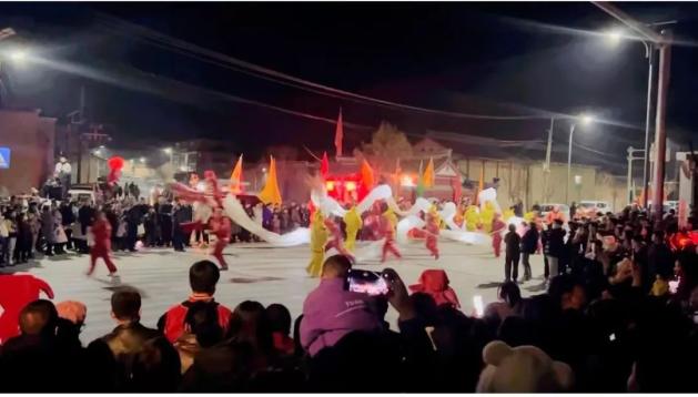 傍晚7点,伴随着欢快的鼓点,舞龙队的队员们身穿鲜艳的服装,头戴五彩头饰,象征着太平吉祥、国泰民安的两条白色“长龙”在他们的卖力挥舞下,翻腾跳跃、威风凛凛,舞出了新时代群众的精气神。