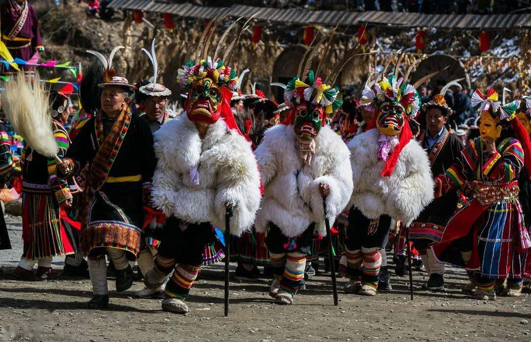 在文县铁楼乡,白马藏族用跳“池哥昼”来迎接新年,各村有自己规定的时间和特定的表演人员,正月十三从麦贡山开始,小村寨跳一天,大村寨跳两天,由东向西顺接表演,直到正月十七草坡山跳完,白马人的“池哥昼”才算结束。