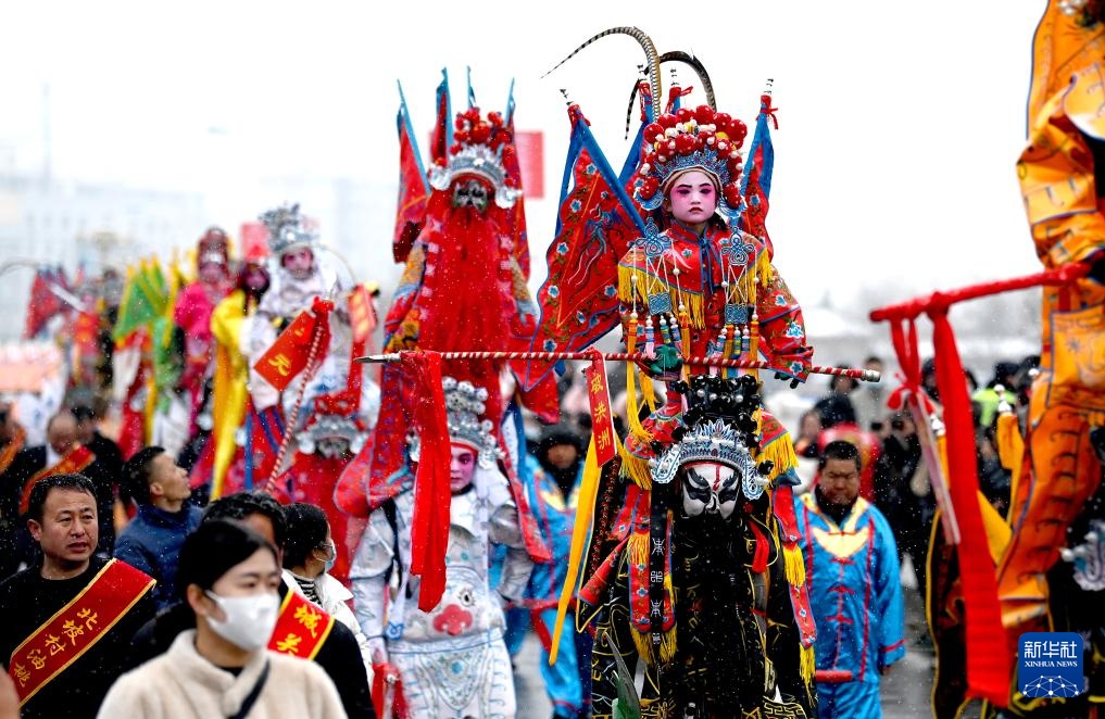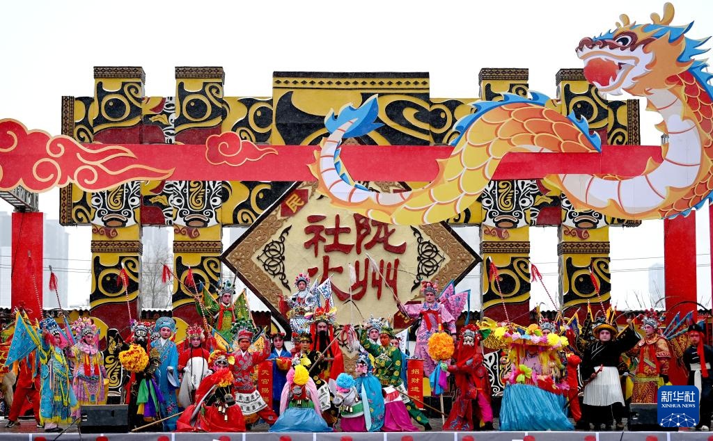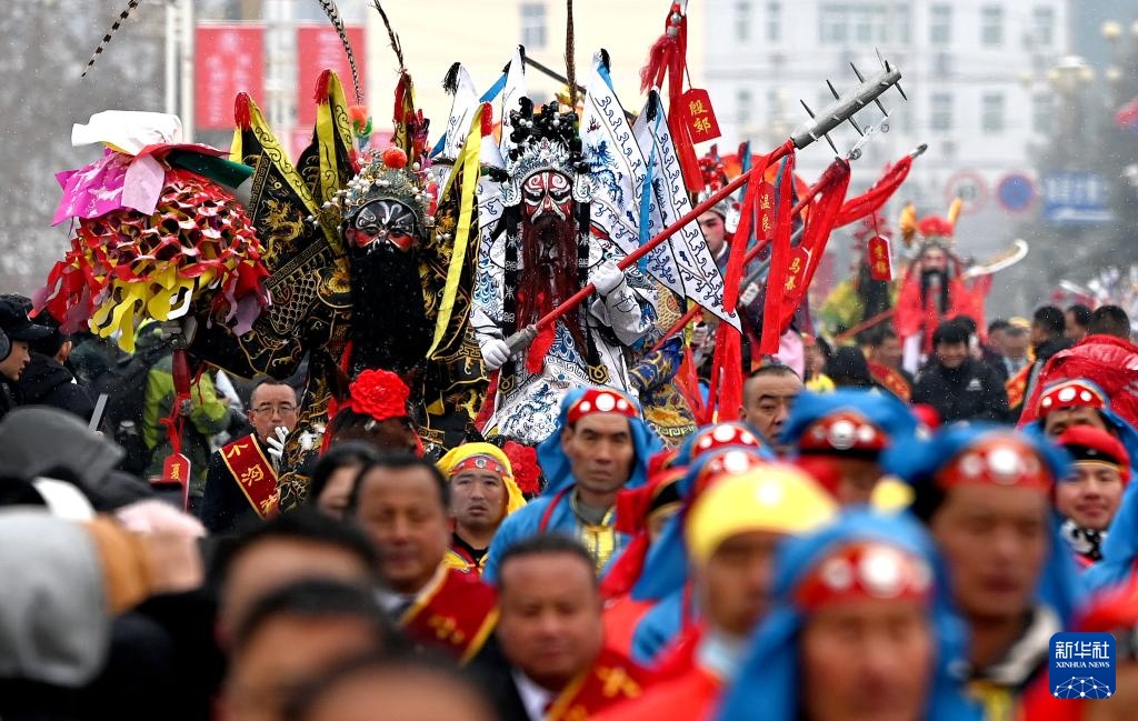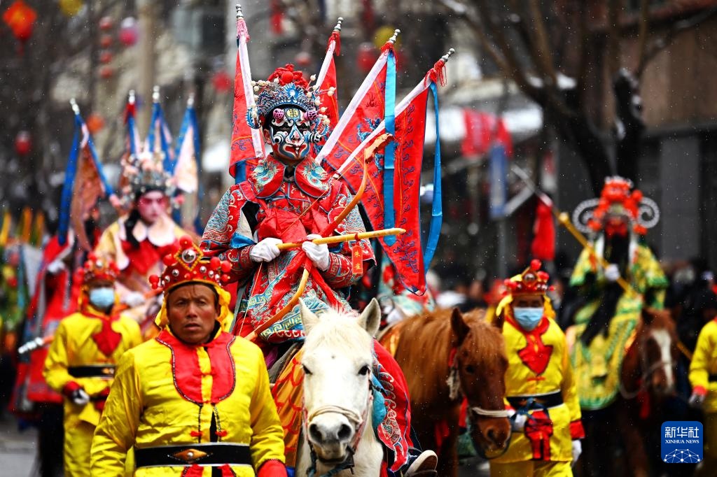 当日是农历正月十三,来自陕西各地市的民间社火代表队齐聚陕西陇县,进行社火展演及巡游活动。在陕西,每年春节期间人们纷纷装扮社火,走乡串户,进行拜年迎春游演。