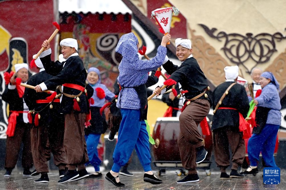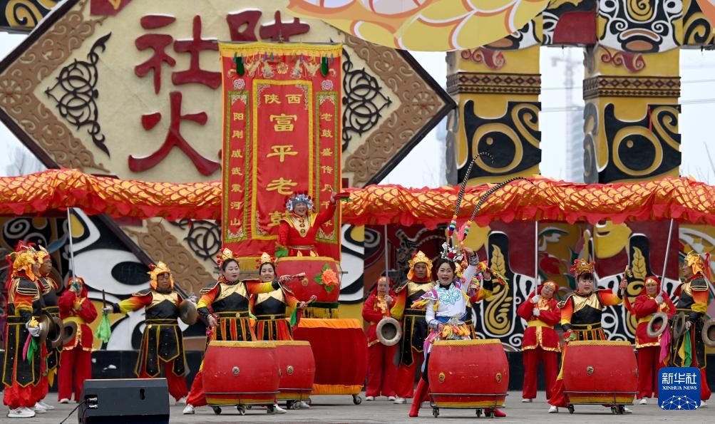 2月22日,在陇州社火过大年暨陕西省民间社火展演上,来自渭南市富平县的社火队在表演富平老鼓。