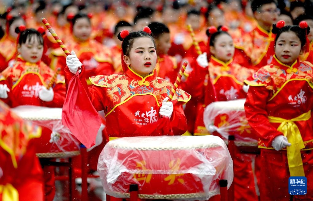 2月22日,在陇州社火过大年暨陕西省民间社火展演上,陇县百人少儿锣鼓队在进行巡游。