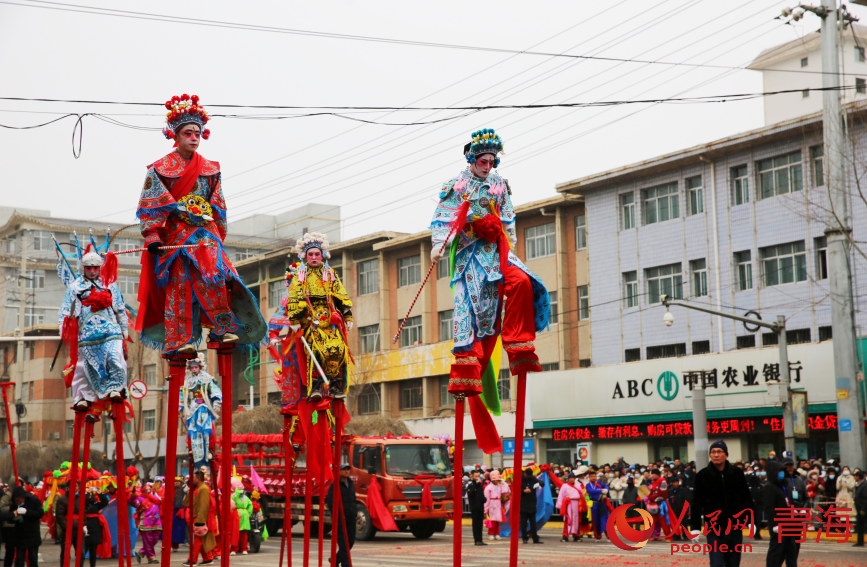社火巡演中的高跷表演现场。人民网 马可欣摄