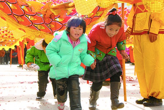舞龙开始时,看社火的人们为了沾一点龙的福气,会纷纷跑进场内,在龙身子底下钻过来钻过去,称之为“过关”。每当这时候,场上的舞龙者也会绷直龙身,好让乡亲们抱着孩子,扶着老人,从龙身子下面钻过,求得一份新年的吉祥和喜庆。笔者小时候最期待这一时刻,总是迫不及待地冲出人群,从黄龙的龙头下面开始,一节一节依次从龙身下绕过,再从青龙的龙尾依次跑回来。即便到了如今,听到锣鼓和唢呐声响起,还是会不由自主地跑到龙身下面去“过关”。还有那胆大的,会用力从龙头上揪下几根龙须,拿回家去缝在小孩的衣服上,据说可以保佑小孩邪祟不侵。