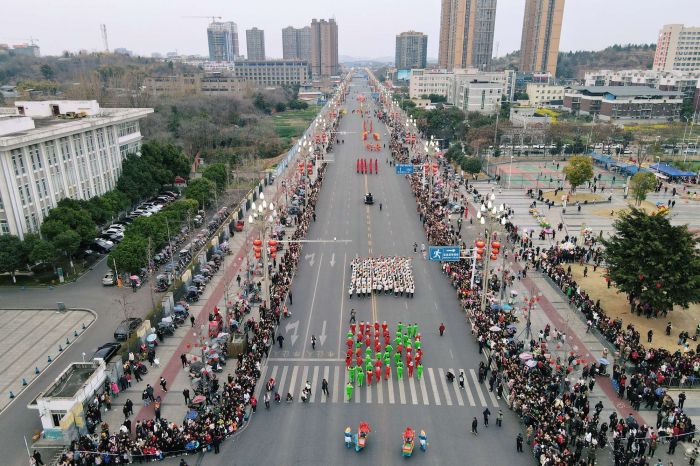 18时许,县文化广场及周边道路地段人气爆棚,观众里三层、外三层,将活动现场围得水泄不通。在欢快的乐曲中,活动的“重头戏”民俗巡游热闹上演,舞龙队、舞狮队、腰鼓队、莲萧队、大头娃娃表演队、灯笼队、彩绸队、彩扇队等巡游队伍一路载歌载舞、踏歌前行,游行队伍沿一环路东段,自县政务服务中心红绿灯路口出发,至祥瑞国际红绿灯路口绕回,历时近1小时。