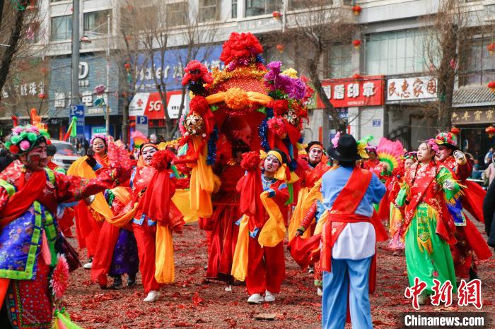 图为青海省西宁市湟中区进行社火巡演。 马铭言 摄