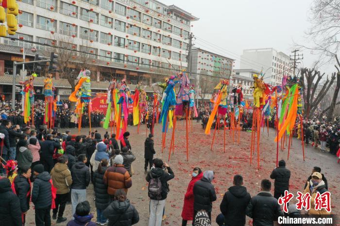 2月21日,中国农历正月十二,青海省西宁市湟中区进行社火巡演,伴随锣鼓鞭炮声,舞龙、舞狮、“大身子”、老秧歌、高跷等节目精彩上演,“杨六郎”“七仙女”“孙悟空”等70名高跷演员和500多名社火演员在降雪天气中为民众祝福祈愿。