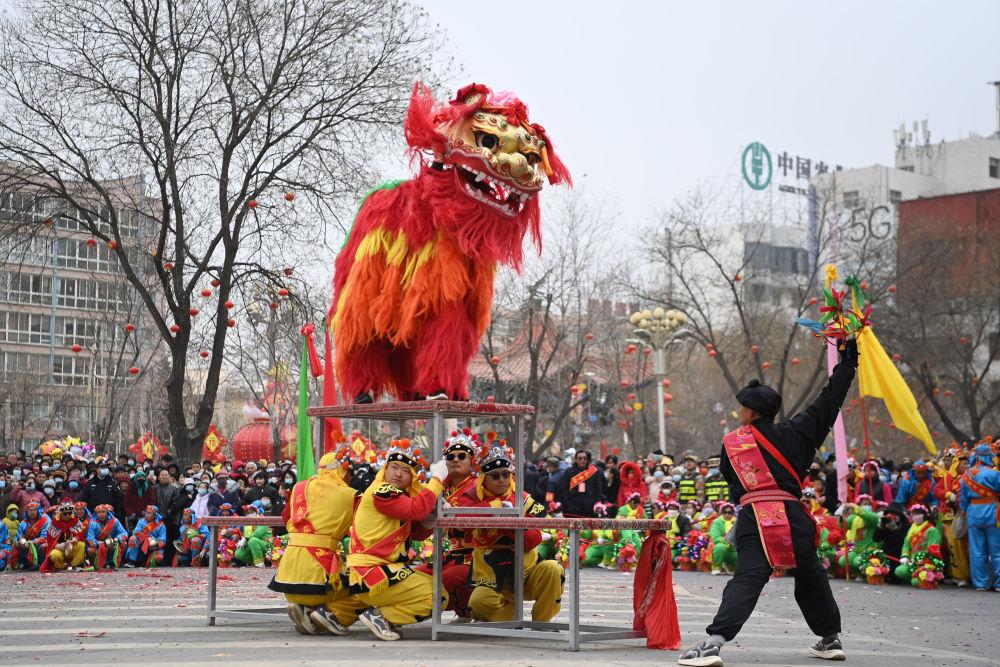 当日是农历正月十一,在甘肃省兰州市榆中县,多个农村社火队在县城进行展演,舞龙舞狮,热闹非凡。
