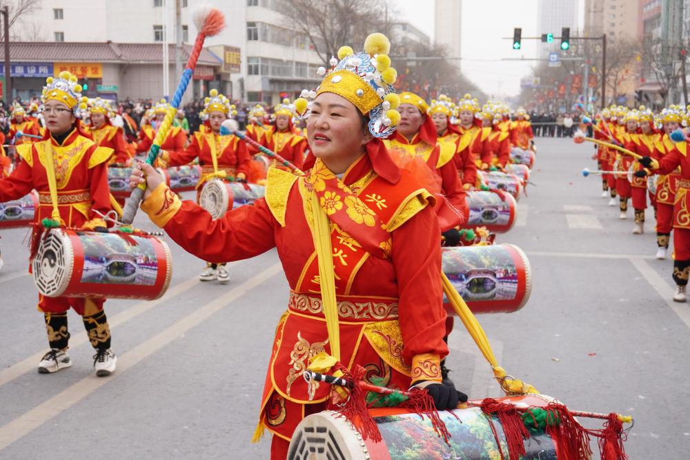 2月20日,在榆中县城关镇,兴隆山村社火队在表演太平鼓。新华社记者 马希平 摄