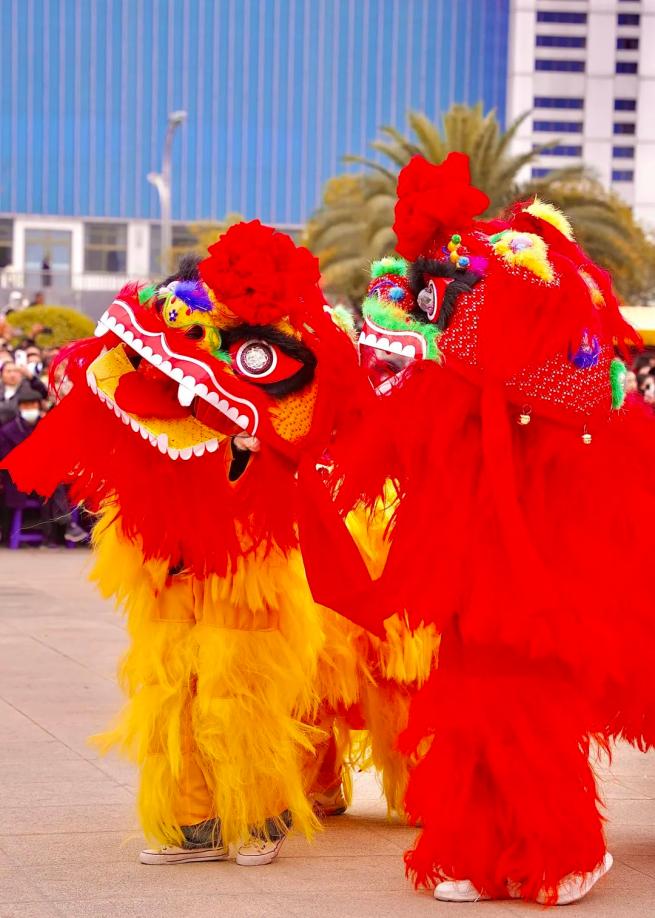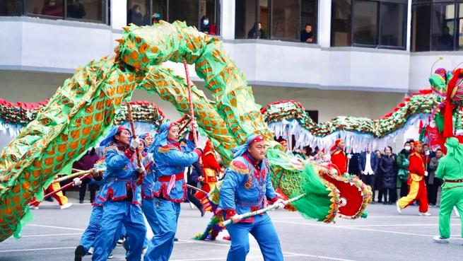 狮舞龙腾歌盛世,乡村社火拜大年。
