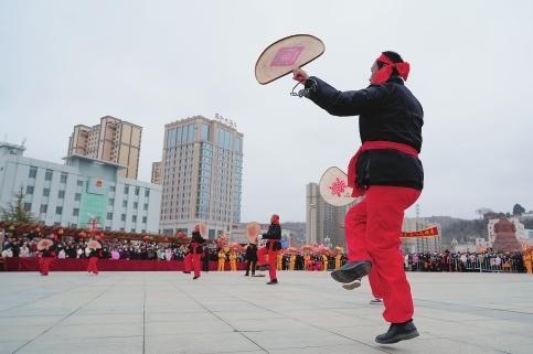 连日来,西和县各乡镇锣鼓喧天,热闹非凡,舞龙舞狮、划旱船、“春倌”说春、羊皮扇鼓、舞秧歌、牧牛等表演轮番上阵,社火演员们用铿锵有力的鼓点、淳朴豪放的表演,为大家呈上一道喜庆、热闹、丰盛的节日“文化大餐”。图为西和伏羲广场进行的羊皮扇鼓表演。本报通讯员 魏朵朵 摄