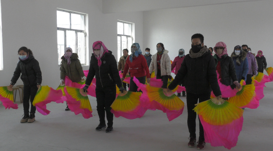 数九寒冬,在排练老师的指导下,秧歌队员们却依旧热情高涨、不厌其烦地练习着每个动作,一次次地重复,一次次地纠正,尽管非常疲累,但她们的脸上始终洋溢着幸福的微笑,优美的曲调,翻飞的彩扇,整齐的舞步,不断变换的队形和充满激情的表演,呈现出一片排练社火的热闹景象。