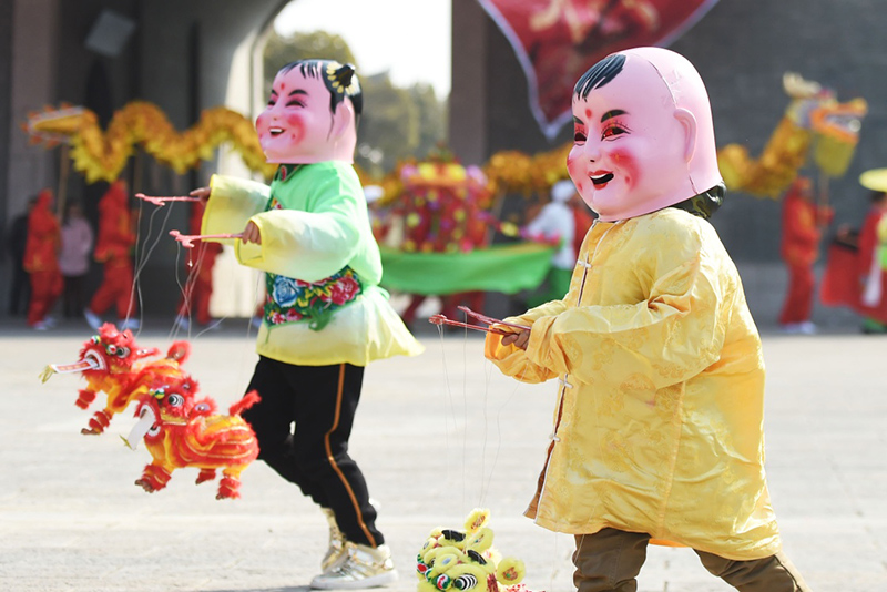 2月17日,民间艺人在江苏省金湖县文化广场装扮成大头娃娃参加民俗表演。