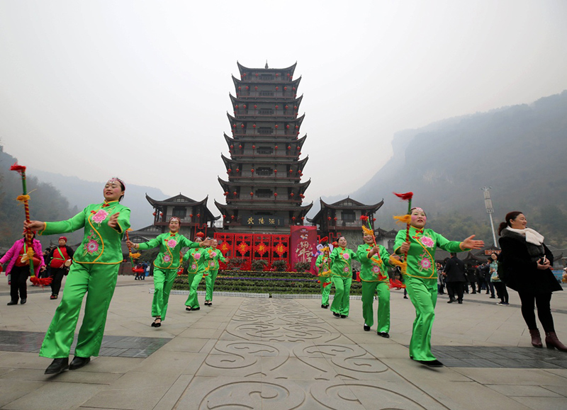 2月17日,在湖南张家界市武陵源区吴家峪门票站游客中心,当地居民表演自编自导的节目《九子鞭》。