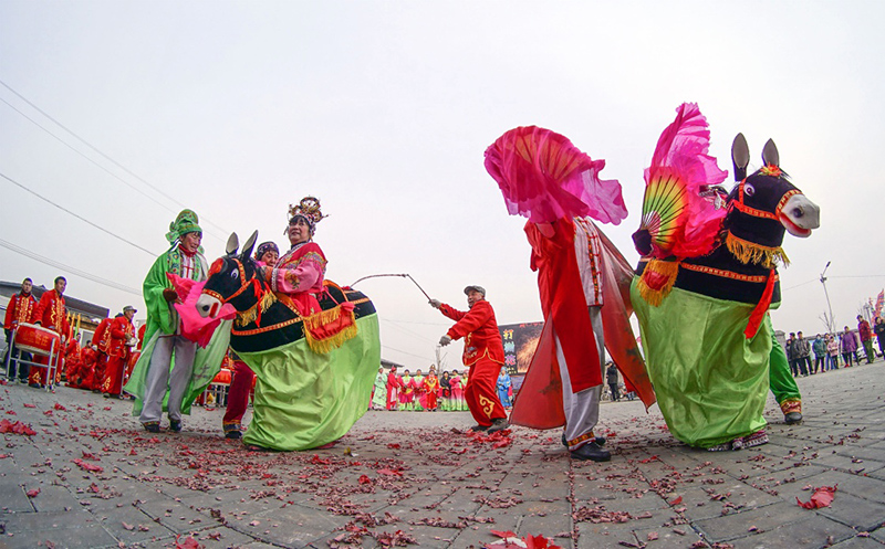 2月17日,河北遵化山里各庄村农民花会队在村广场表演划旱船。