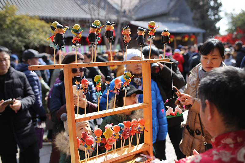 2月17日,市民在山东青岛天后宫新正民俗文化庙会上观看面塑制作。