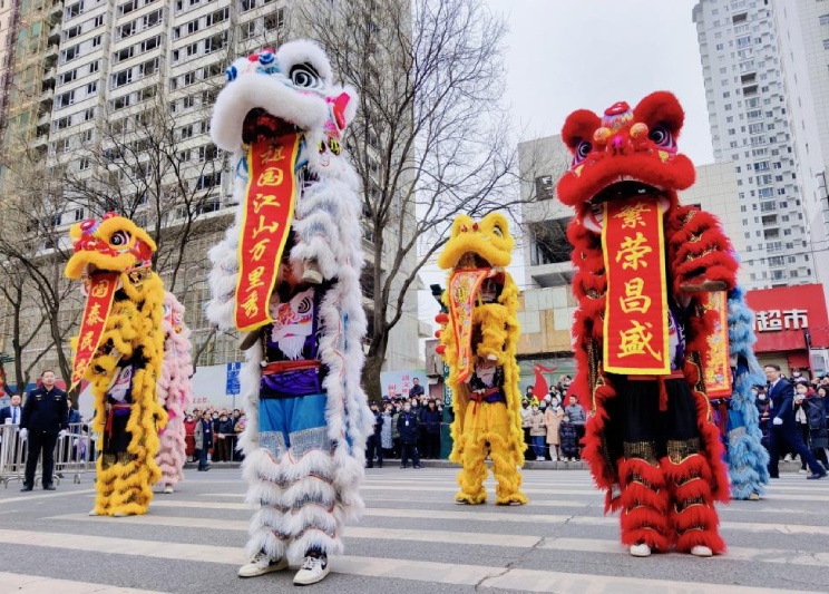 舞狮演员在社火巡游活动中表演。陕西宝鸡凤翔区供图