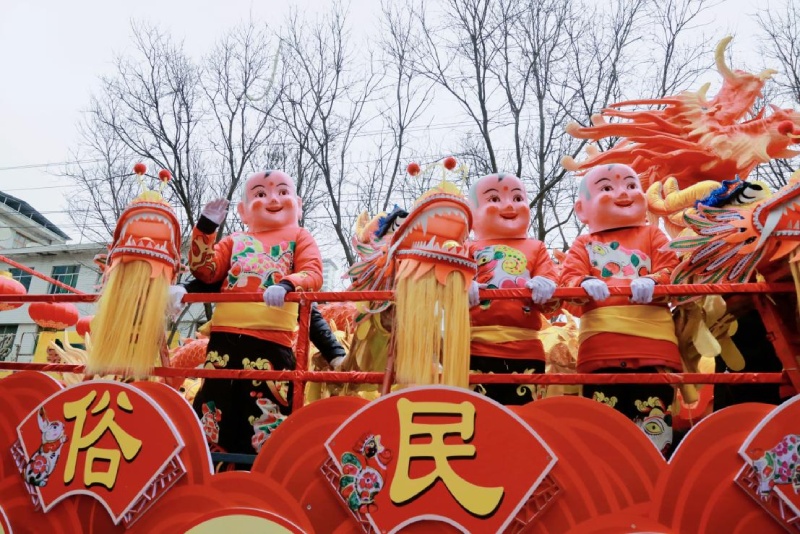 宝鸡凤翔车社火表演,象征美好祝愿的彩车队伍纷纷亮相。陕西宝鸡凤翔区供图