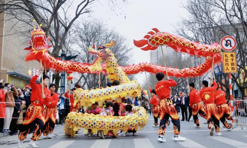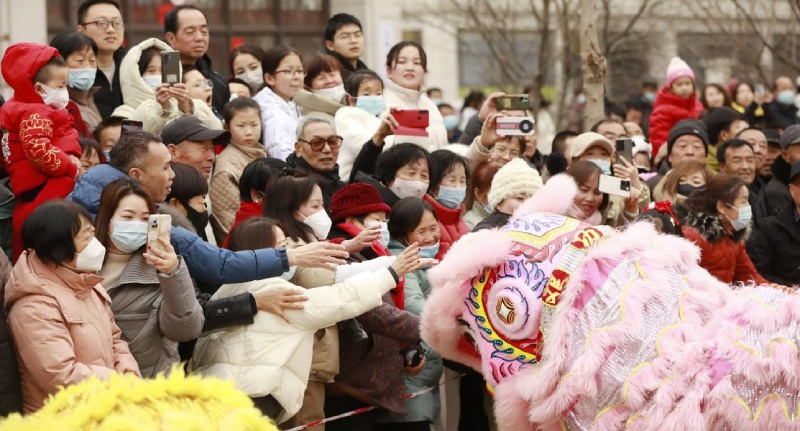 2月19日,农历正月初十,陕西省宝鸡市凤翔区举办“龙腾盛世”主题社火游活动,循着响彻云霄的锣鼓乐声看过去,只见秧歌队、游龙舞狮队的演员手执道具,或奔走腾挪,或作揖祈福,神秘又喜庆的表演吸引了众多游客驻足观赏。