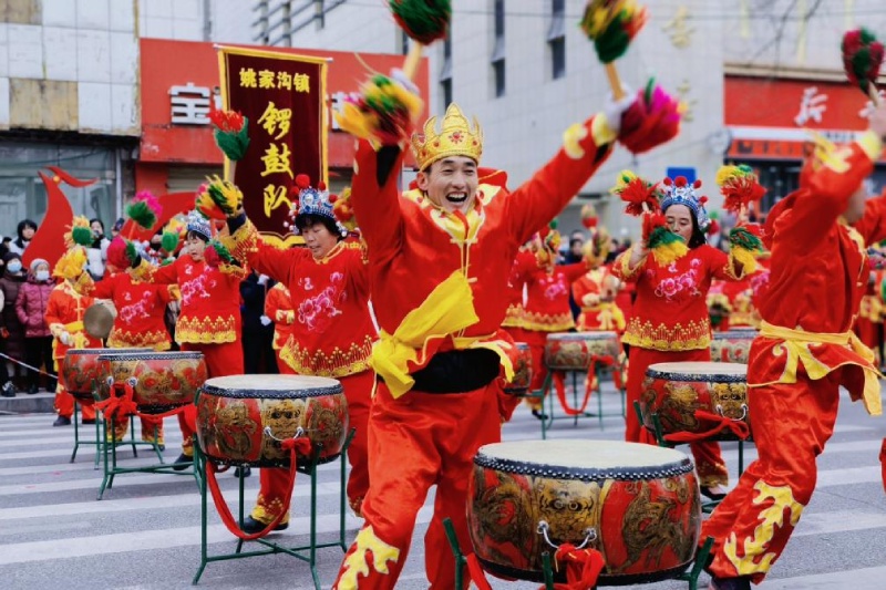 锣鼓演员在社火巡游活动中表演。陕西宝鸡凤翔区供图