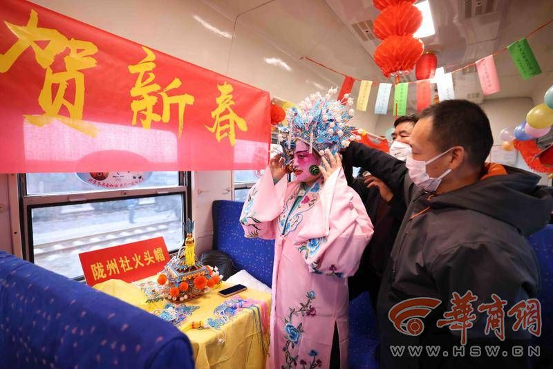“新年绽春意,上元花颜开,欢迎大家乘坐6072次‘文化慢火车’一起闹元宵!”上午8时,在宝鸡开往平凉的列车上,伴随着一曲悠扬的陇州小调,车厢里拉开了联欢活动的序幕。