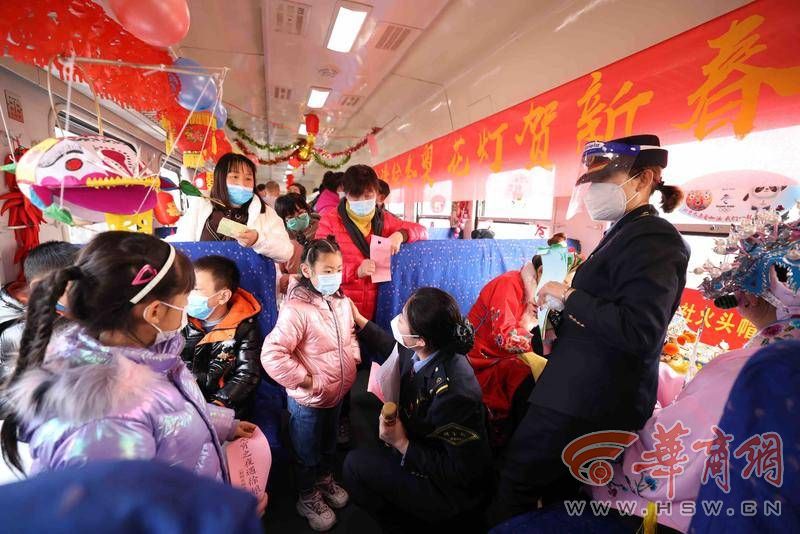 列车的“民俗文化车厢”里,鲜艳的花灯、火红的窗花、悬挂的字谜映满眼帘,“努力加油干,一起向未来”“服务沿线群众,助力乡村振兴”等手举牌随处可见,车厢两头还张贴了冬奥会宣传海报,吸引来大量旅客,大家纷纷拿出手机,定格这浓浓的年味。