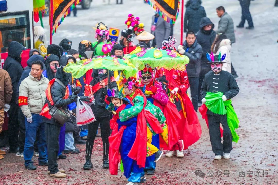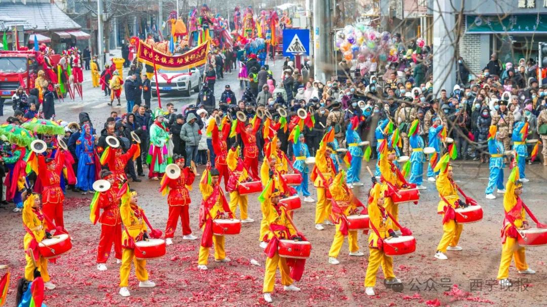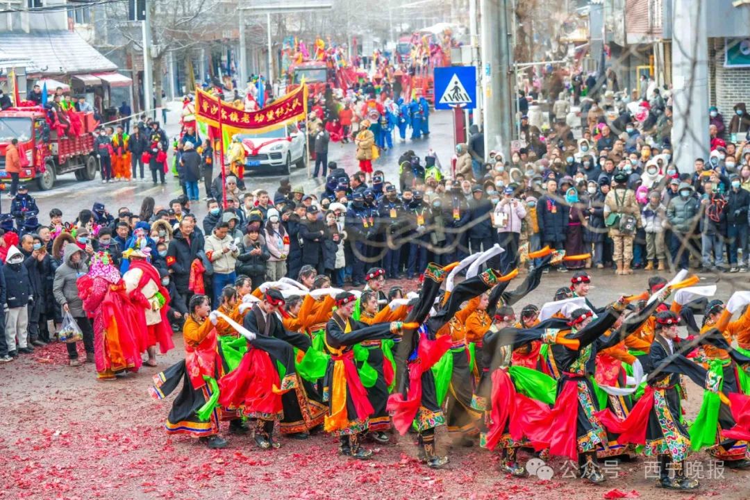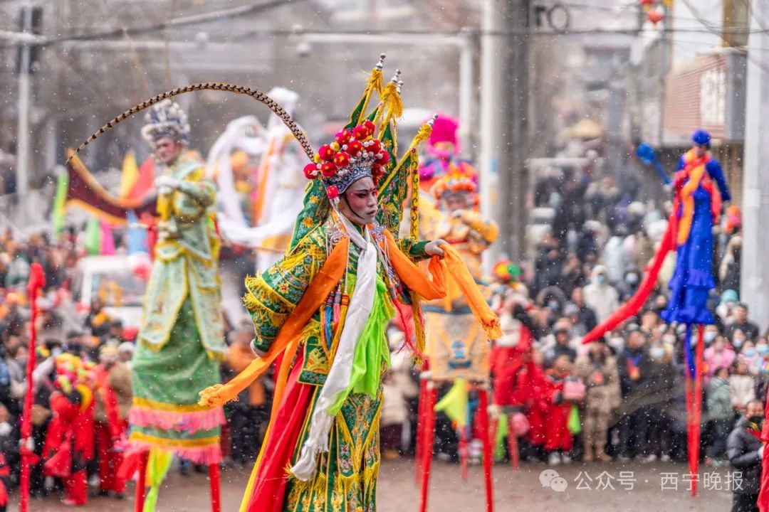 震天的锣鼓、腾飞的巨龙、威武的雄狮、喜庆的高跷……传统社火让过年的气氛铺满了大地,锣鼓震天、鞭炮齐鸣,彩旗飘扬,演员们载歌载舞中表达了群众迎新春、庆盛世的美好愿望。
