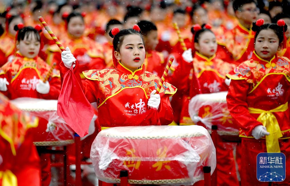 2月22日,在陇州社火过大年暨陕西省民间社火展演上,陇县百人少儿锣鼓队在进行巡游。