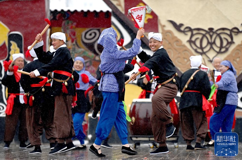 2月22日,在陇州社火过大年暨陕西省民间社火展演上,来自咸阳市的社火队在表演秦汉战鼓。