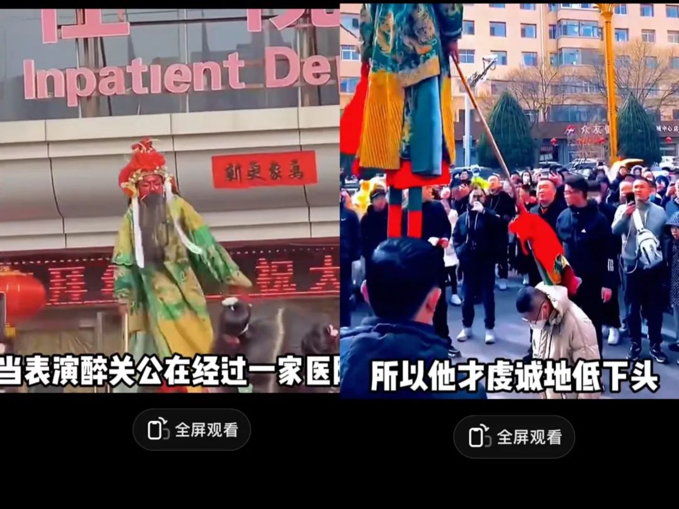 视频里,两米高跷上的关二爷,在喝掉3斤白酒后手持大刀来回踱步,因为醉酒晃晃悠悠地行走在街道上,路边挤满围观和祈福的人。路中间,一个爷爷抱着孙女叩拜,求醉关公从自己的头上跨过去,爷孙身后的醉关公手提大刀,特意避开了爷爷的头,用高跷滑了过去。关公行走到医院门口,一个中年男人跪在路中间跪求醉关公从自己的头上跨过,这份沉甸甸的祈求藏着对家人无尽的爱。