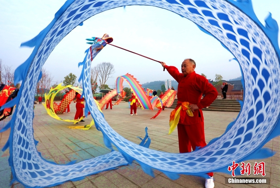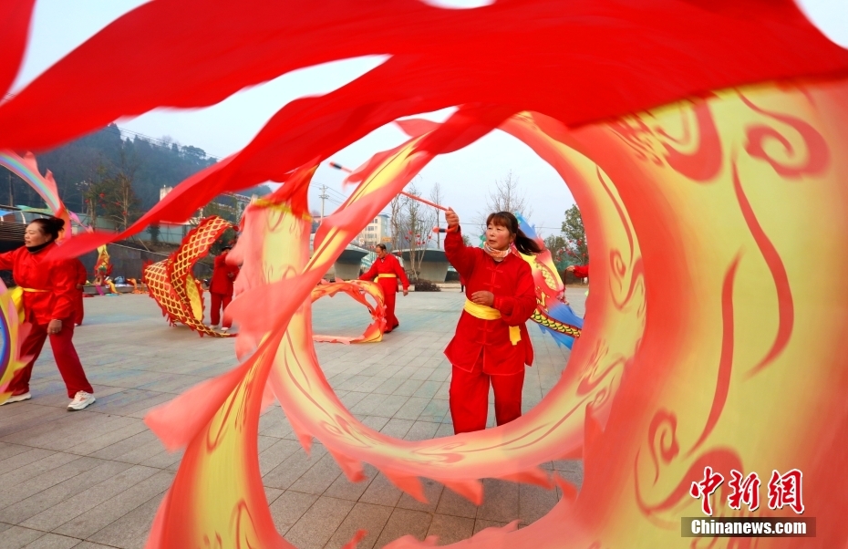 1月22日,在四川省眉山市仁寿县文宫镇的文化公园,“彩带龙”爱好者正在舞“彩带龙”喜庆新年。 中新社发 潘建勇 摄 图片来源:CNSphoto