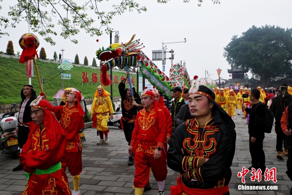 1月22日,江苏连云港,农历正月初一,海州区举办“春满海州”古城年会,踩街队伍在海州古城进行舞龙等民俗表演。 图片来源:视觉中国
