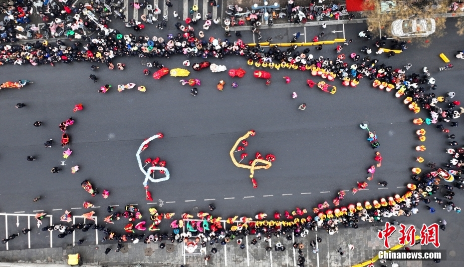 1月22日,农历大年初一,襄阳市襄城区举行2023“兔年民俗大拜年”民间文艺展演活动。在襄阳古城以及各乡镇文化广场,民间艺人们进行舞龙、舞狮、旱船、毛驴、蚌壳、大头娃娃、锣鼓等演出,热热闹闹庆新春。图为民间艺人在襄阳古城进行民俗表演(航拍图)。 杨东 摄