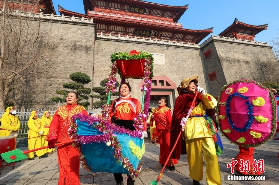 1月22日,江苏连云港,农历正月初一,海州区举办“春满海州”古城年会,在海州古城的朐阳门前,踩街队伍进行腰鼓等民俗表演。 图片来源:视觉中国