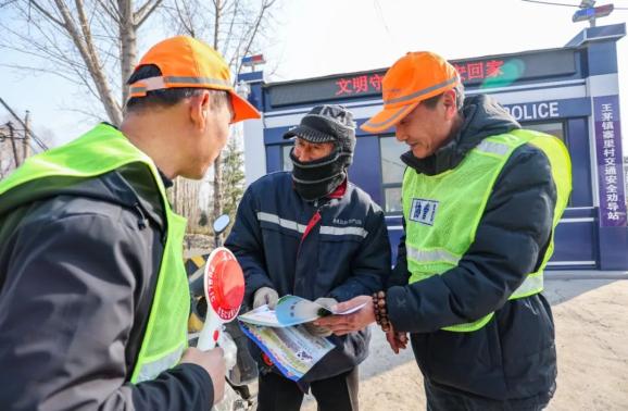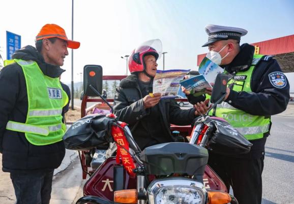 在王茅镇寨里村劝导站,民警手持宣传资料,向村民讲解不佩戴安全头盔、三轮车违法载人、面包车超员、涉牌涉证等严重交通违法行为的危害。提醒广大群众要时刻牢记“安全”二字,切实做到警钟长鸣,防患未然,远离交通事故。