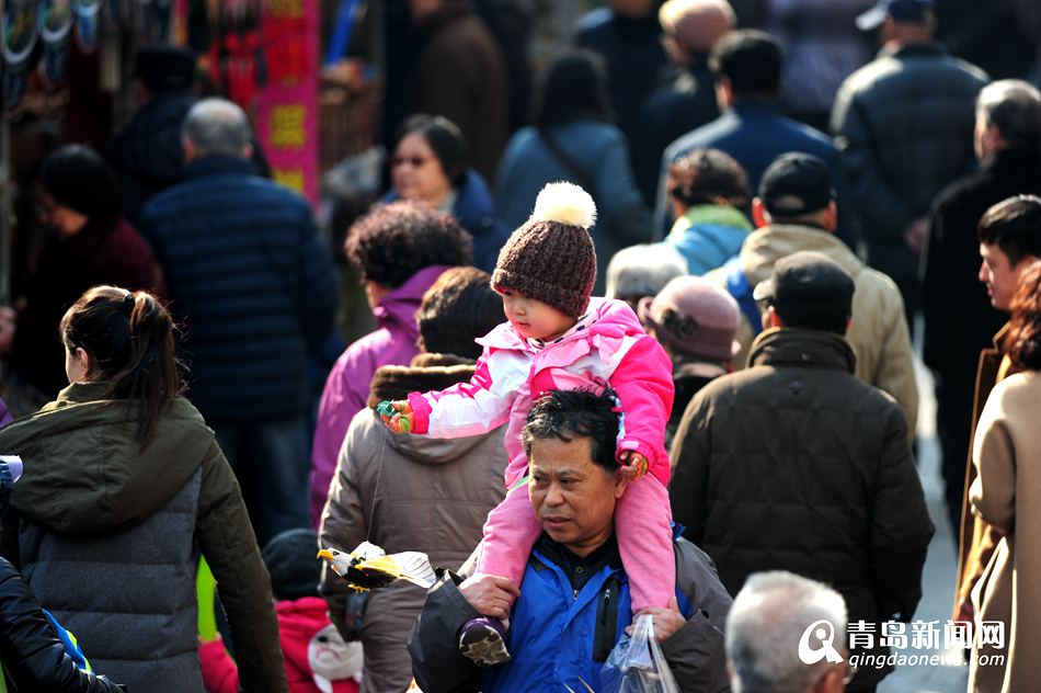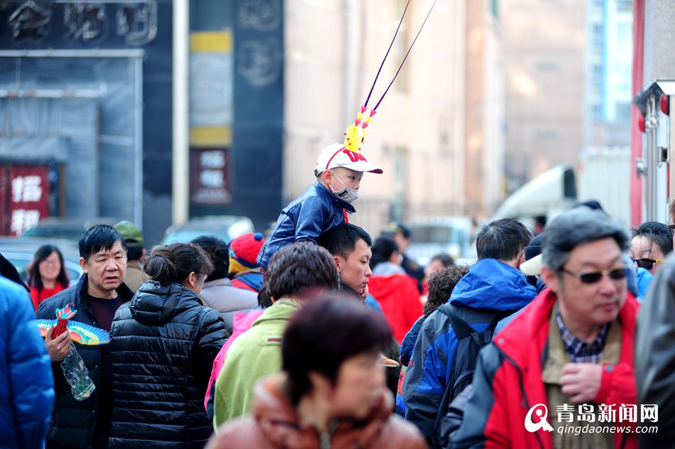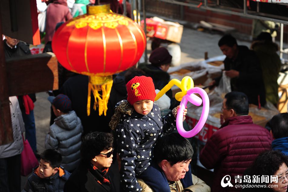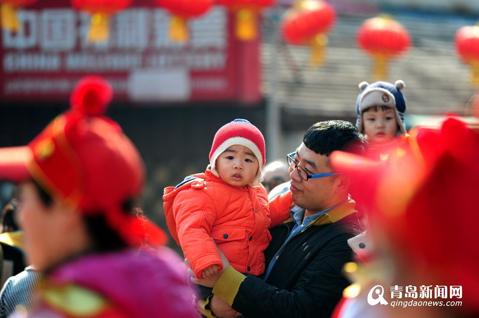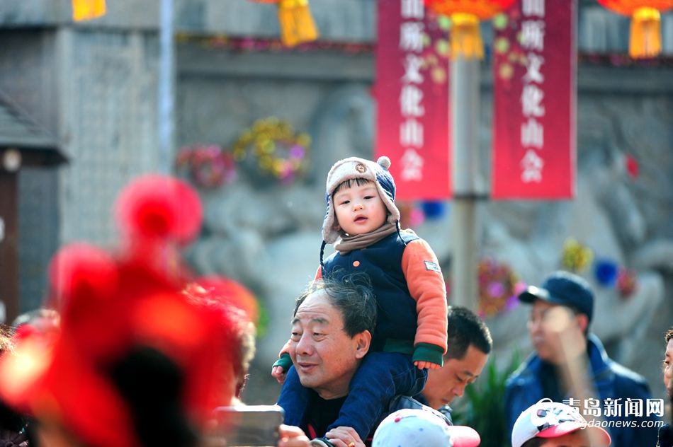节会现场人潮涌动,一些“萌娃酷宝”骑在家长的肩膀上,面对摄影爱好者的“长枪短炮”,各个都不怯场,成为山会上耀眼的小明星。(青岛新闻网记者)