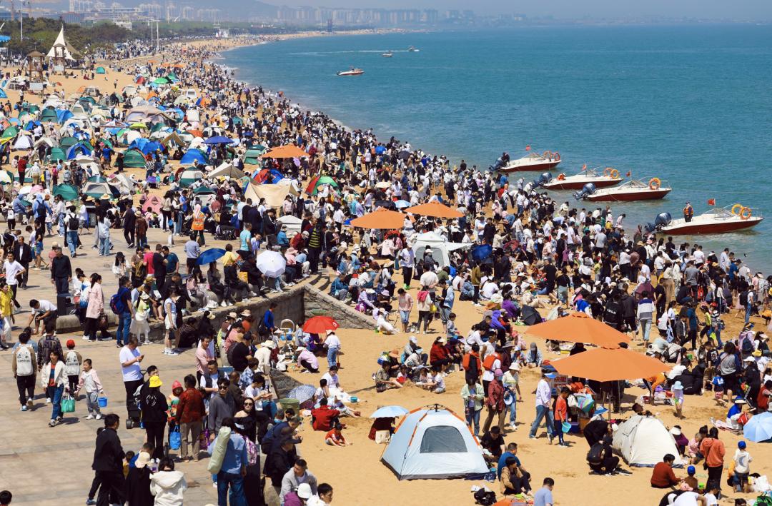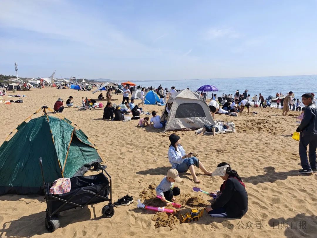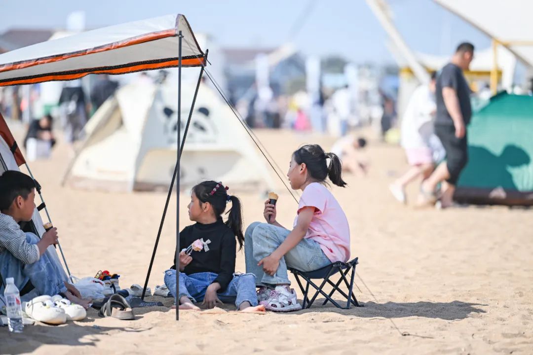 放眼整个沙滩,在蓝天下,在阳光里,构成光亮迷人的一道美丽风景的五彩太阳伞、帐篷在沙滩上星罗棋布,让海滩度假风妥妥拉满。这样轻松惬意的旅行新体验,让喜欢露营的孙女士格外欣喜,这个“五一”假期,她和朋友们带着孩子来到沙滩露营,水果、甜点、辣卤……一应俱全,“就是冲着日照这片干净的沙滩来的,孩子玩沙子,我们大人吹吹海风,聊聊天,身心放松,自有又惬意,在这里享受这别具情趣的沙滩浴,幸福感简直爆棚。”
