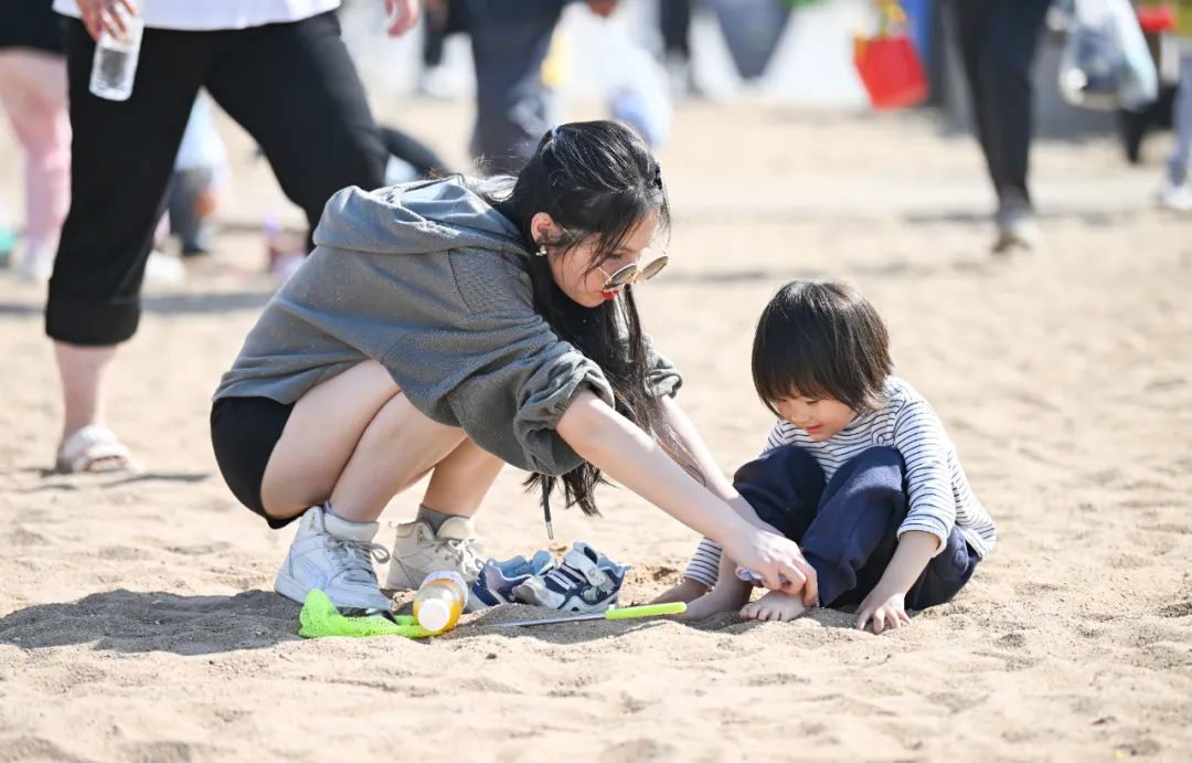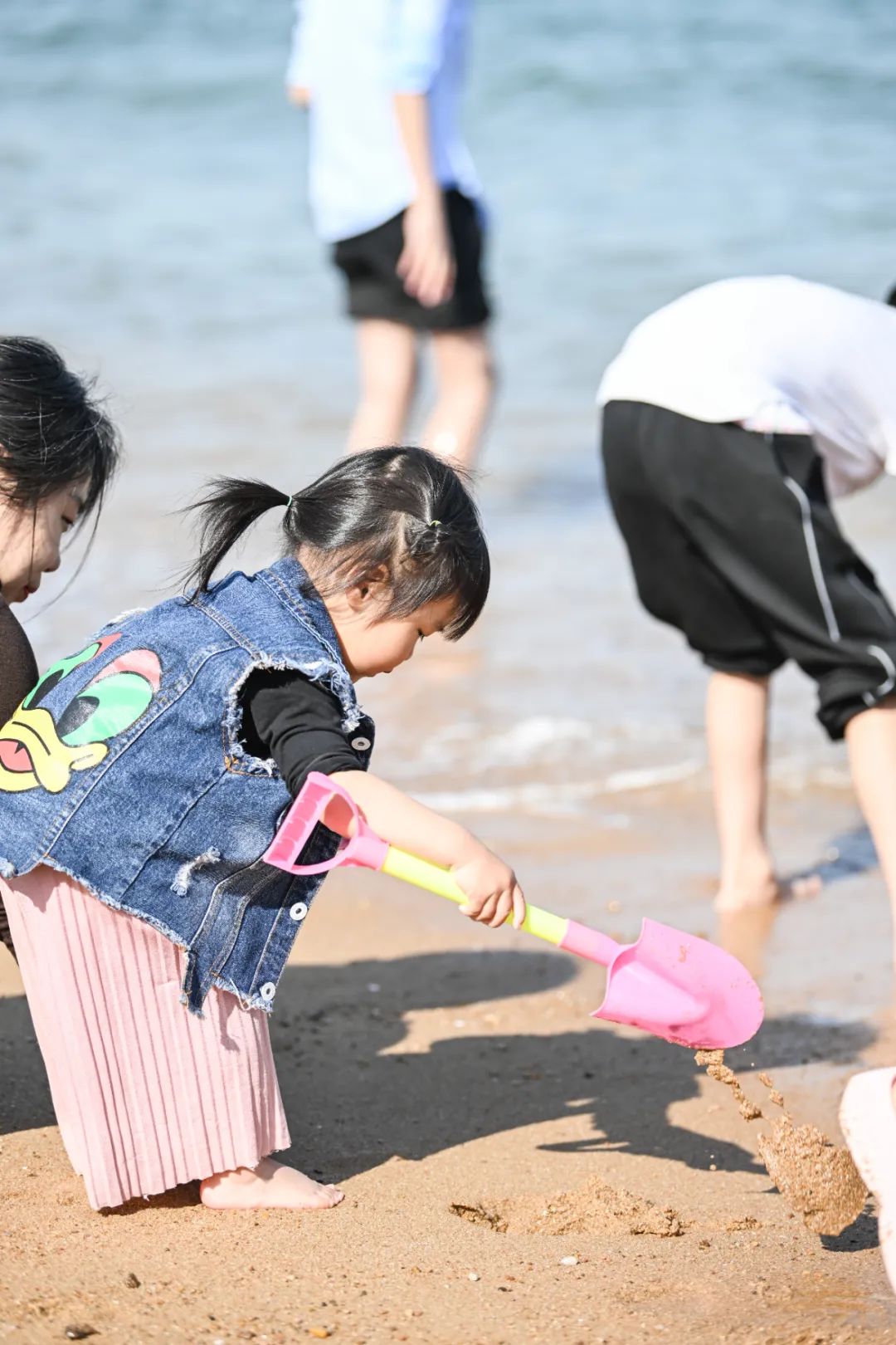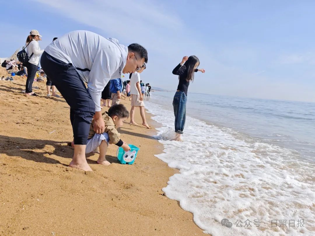 来自临沂的游客张女士,一大早和家人自驾来到日照,按照导航顺利停下车,就直奔这片金沙滩而来,“孩子太喜欢玩沙子了,在家的时候,我们就准备好了小桶和小铲子,来到沙滩,拽都拽不走,根本玩不够!孩子说,这细软的沙子就像自己暖暖的小被子呢!”