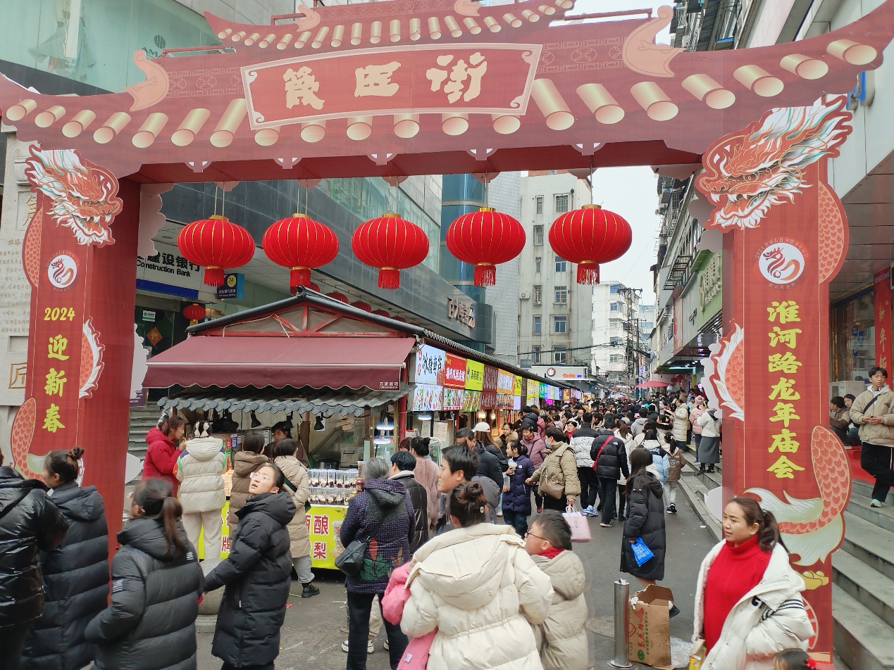 琳琅满目的年货、精彩的民俗表演、各式各样的非遗展……2024年春节期间,“迎新春·淮河路龙年庙会”如火如荼地开展,现场吸引了广大消费者和游客。百货大楼内,往来的顾客络绎不绝,每个商家前基本都有问询或者试穿戴商品的顾客,收银台忙碌不停。